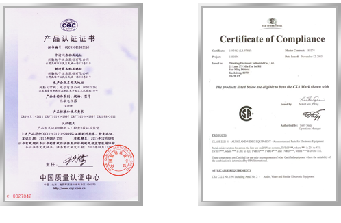 產品已通過ISO9001及TS16949的品質管理系統,相關產品通過UL、CSA、VDE、TUV、CQC等國際安規系統的認證;