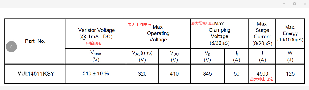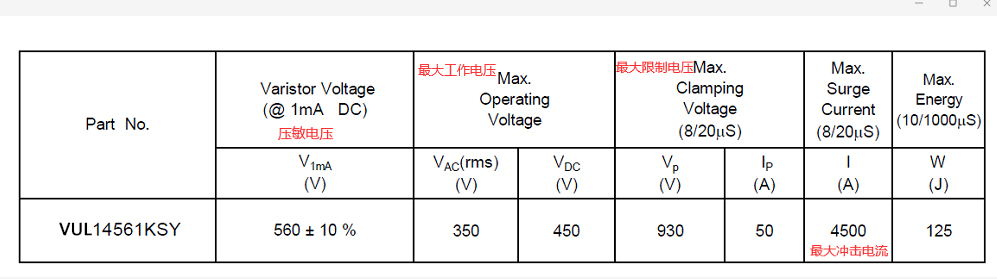 2. 關于壓敏選型,例如220V的工作電壓,由于電網有波動因素,我們經驗的需要,加上一個安全系數。公式:220*1.414=311,得出311V的工作電壓,那么選用的壓敏工作電壓就要大于我們得出的電網工作電壓311V。如下圖產品TVR14511KSY的工作電壓VAC是320V,大于電網工作電壓311V,那么我們就可以選用這款壓敏電阻。但是根據環境電壓波動,可以選用工作電壓再大一點的壓敏電阻,如下圖產品TVR14561KSY,這樣就會更保險。