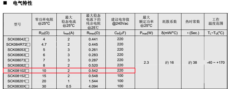 熱敏電阻: TKS 熱敏電阻型號: SCK08102MSY 熱敏電阻片徑: Φ8mm 零功率電阻@25℃: 10Ω 工作溫度范圍: -40℃±150℃ 儲存溫度范圍: -40℃±85℃
