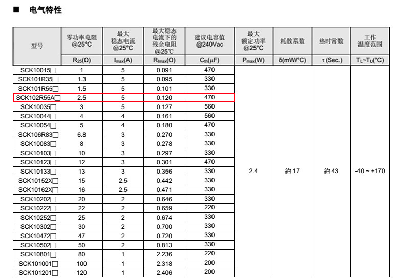 熱敏電阻: TKS 熱敏電阻型號: SCK102R55 熱敏電阻片徑: Φ10mm 零功率電阻@25℃: 2.5Ω 工作溫度范圍: -40℃±170℃ 儲存溫度范圍: -40℃±85℃