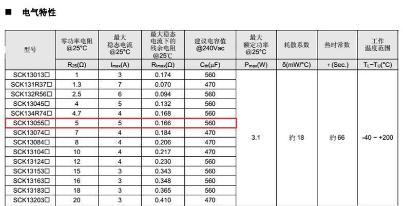 熱敏電阻: VT 熱敏電阻型號: SCK13055MSY 熱敏電阻片徑: Φ13mm 零功率電阻@25℃: 5Ω 工作溫度范圍: -40℃±170℃ 儲存溫度范圍: -40℃±85℃