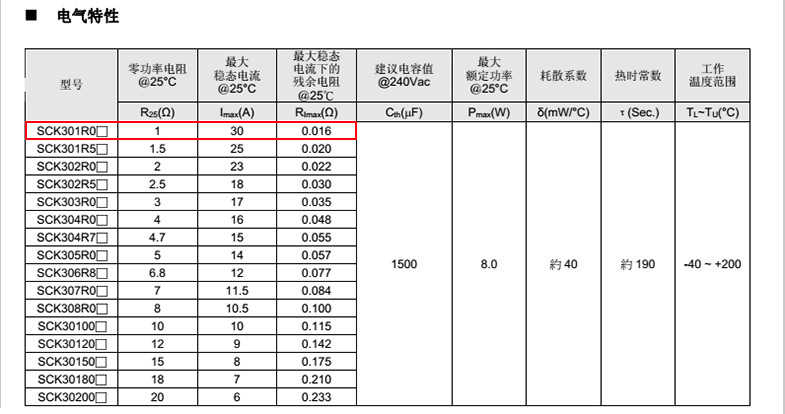 熱敏電阻: VT 熱敏電阻型號: SCK301R0MSY 熱敏電阻片徑: Φ30mm 零功率電阻@25℃: 1Ω 工作溫度范圍: -40℃±200℃ 儲存溫度范圍: -40℃±85℃