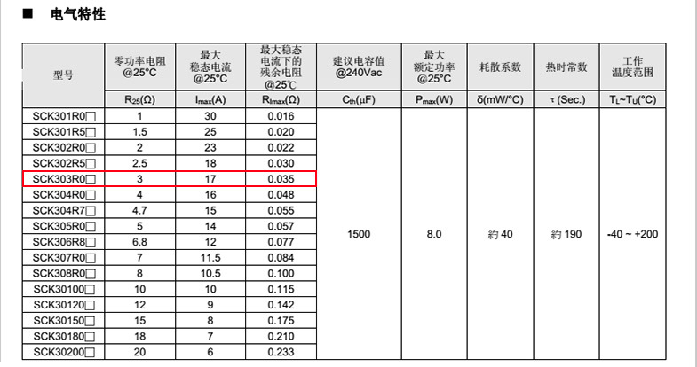 熱敏電阻: VT 熱敏電阻型號(hào): SCK303R0MSY 熱敏電阻片徑: Φ30mm 零功率電阻@25℃: 3Ω 工作溫度范圍: -40℃±200℃ 儲(chǔ)存溫度范圍: -40℃±85℃