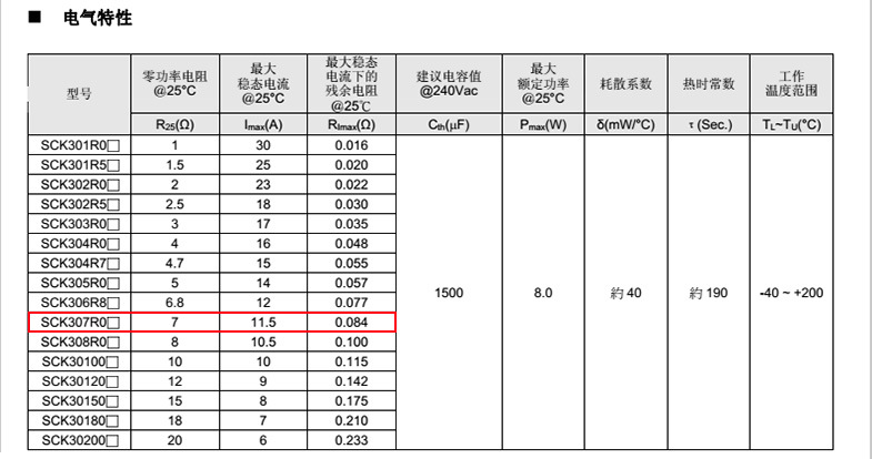 熱敏電阻: VT 熱敏電阻型號(hào): SCK307R0MSY 熱敏電阻片徑: Φ30mm 零功率電阻@25℃: 7Ω 工作溫度范圍: -40℃±200℃ 儲(chǔ)存溫度范圍: -40℃±85℃